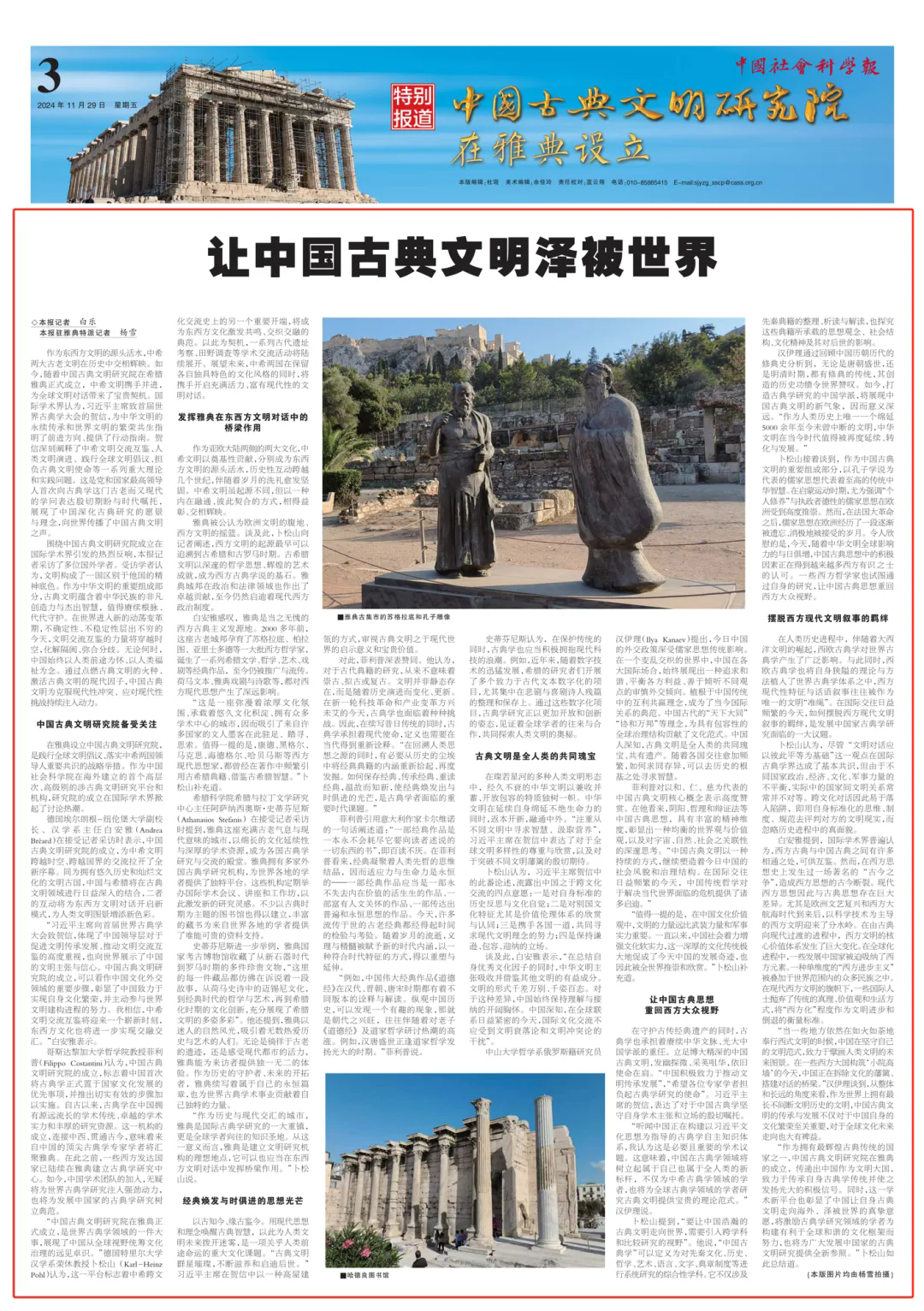 “作為擁有最輝煌古典傳統(tǒng)的國家之一,中國古典文明研究院在雅典的成立,傳遞出中國作為文明大國,致力于傳承自身古典學(xué)傳統(tǒng)并使之發(fā)揚光大的積極信號。同時,這一學(xué)術(shù)新平臺也彰顯了中國讓自身古典文明走向海外、澤被世界的真摯意愿,將激勵古典學(xué)研究領(lǐng)域的學(xué)者為構(gòu)建有利于全球和諧的文化框架而努力,也將為廣大發(fā)展中國家的古典文明研究提供全新參照。”卜松山如此總結(jié)道。
